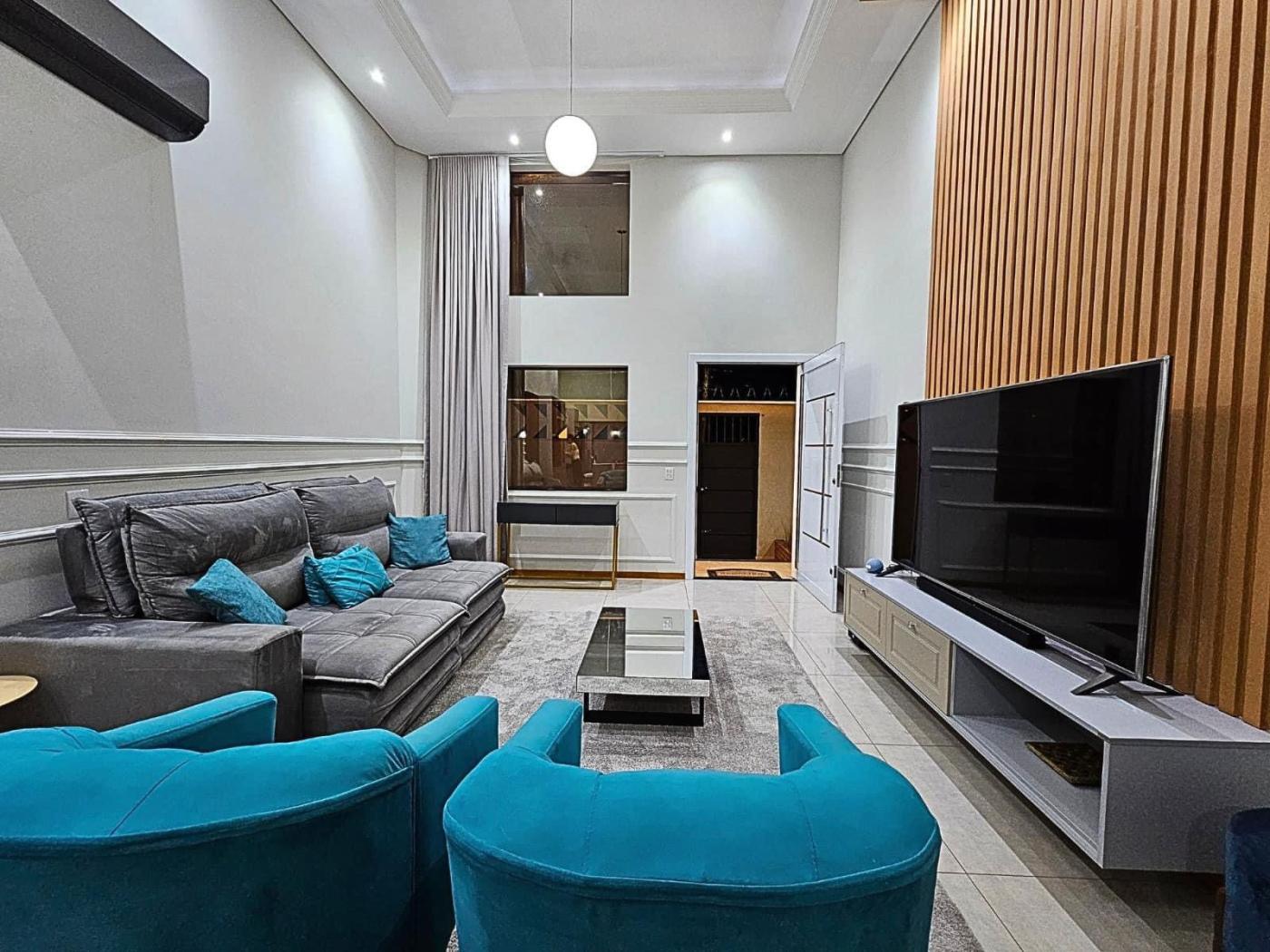 - Sala 2 ambientes com painel ripado, armários planejados, pé direito duplo, sanca, lustres e conceito aberto